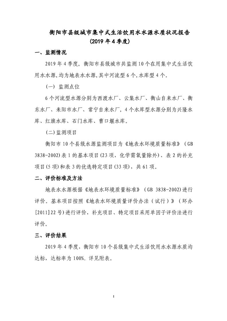 衡陽市縣級(jí)城市集中式生活飲用水水源水質(zhì)狀況報(bào)告(2019年4季度)